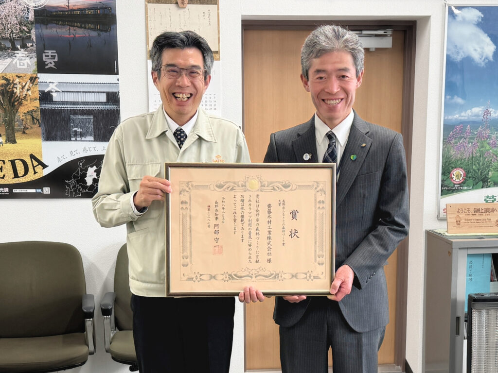 本賞は、長野県が主催し、森林づくりや林業、木材産業の発展に貢献した個人・団体を表彰する制度です。森林を健全な状態で次世代へ引き継ぐことを目的に、地域に根ざした取り組みが評価されます。